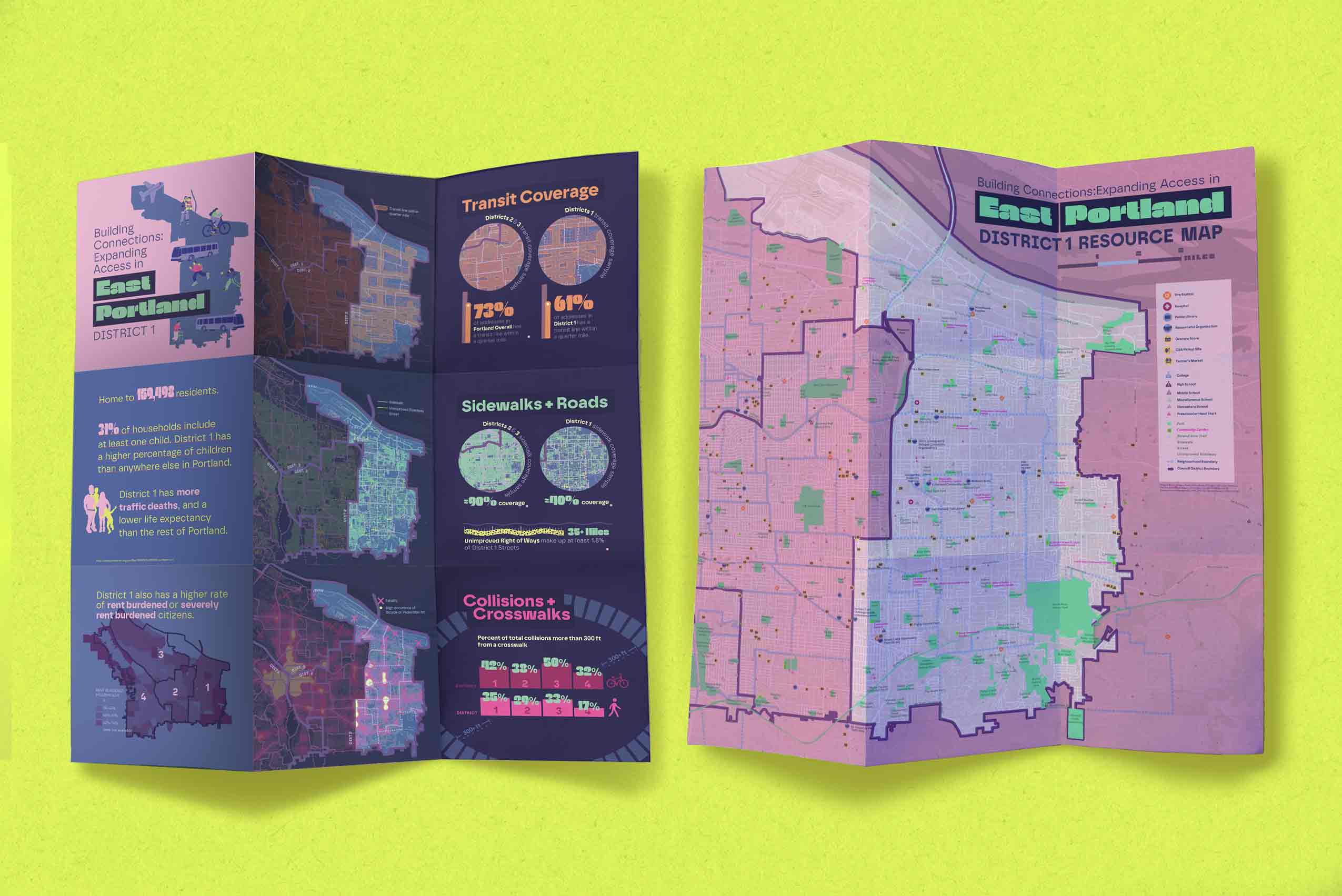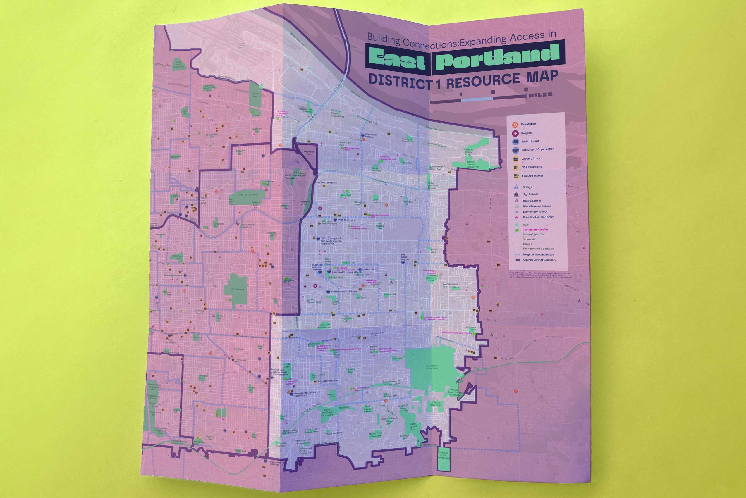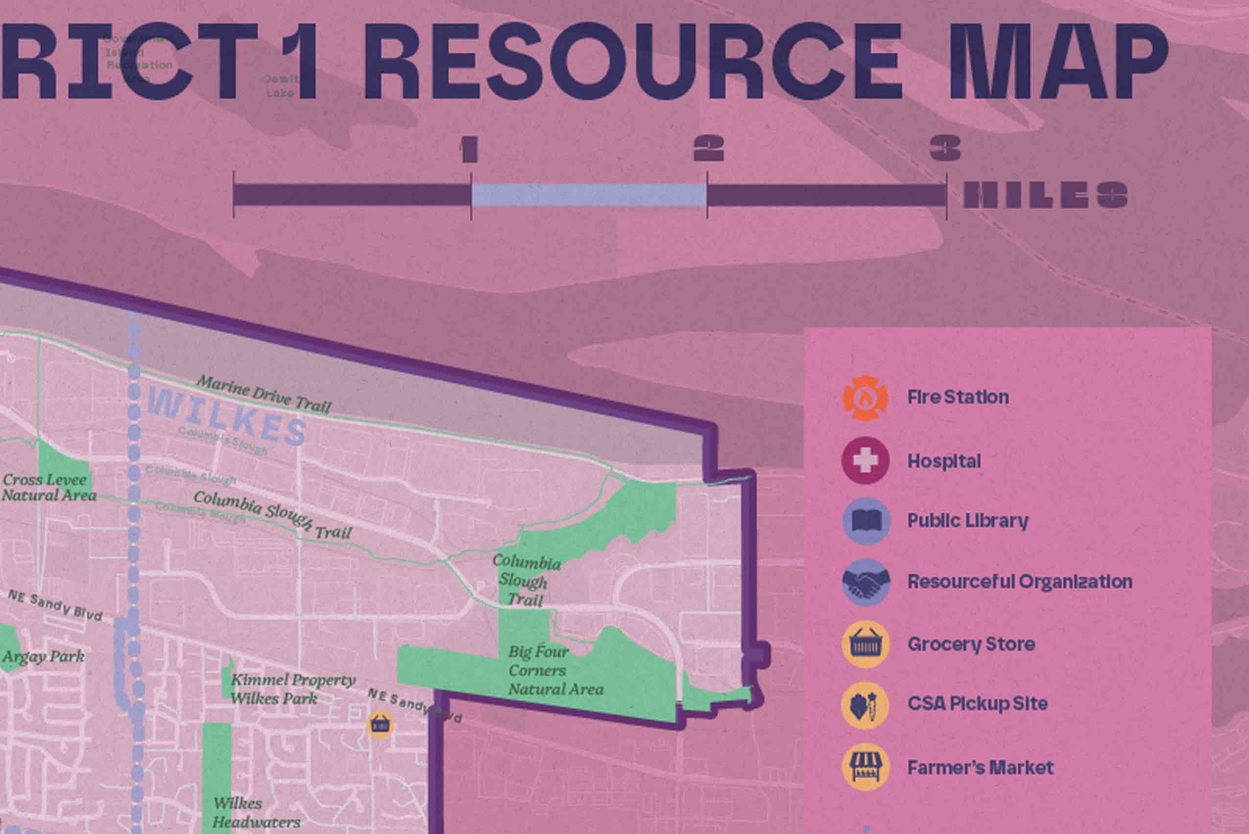 Map of transit disparities and neighborhood resources in East Portland, Council District 1.